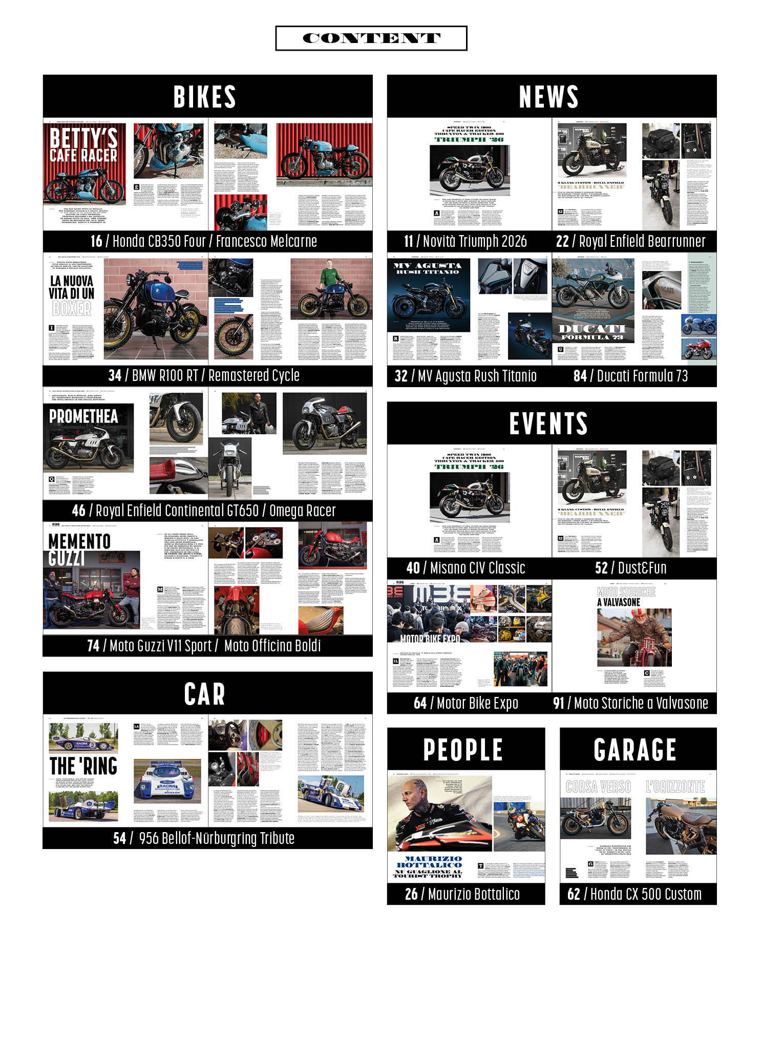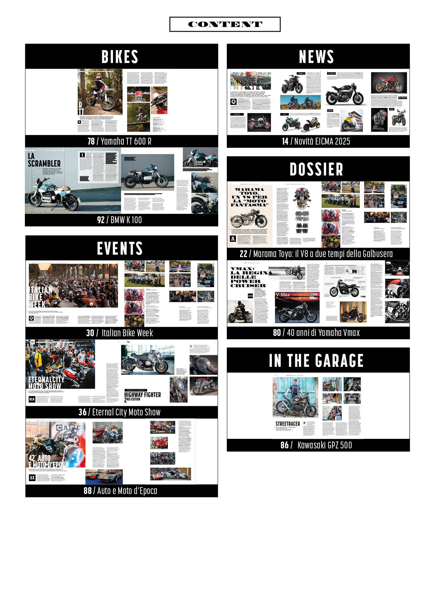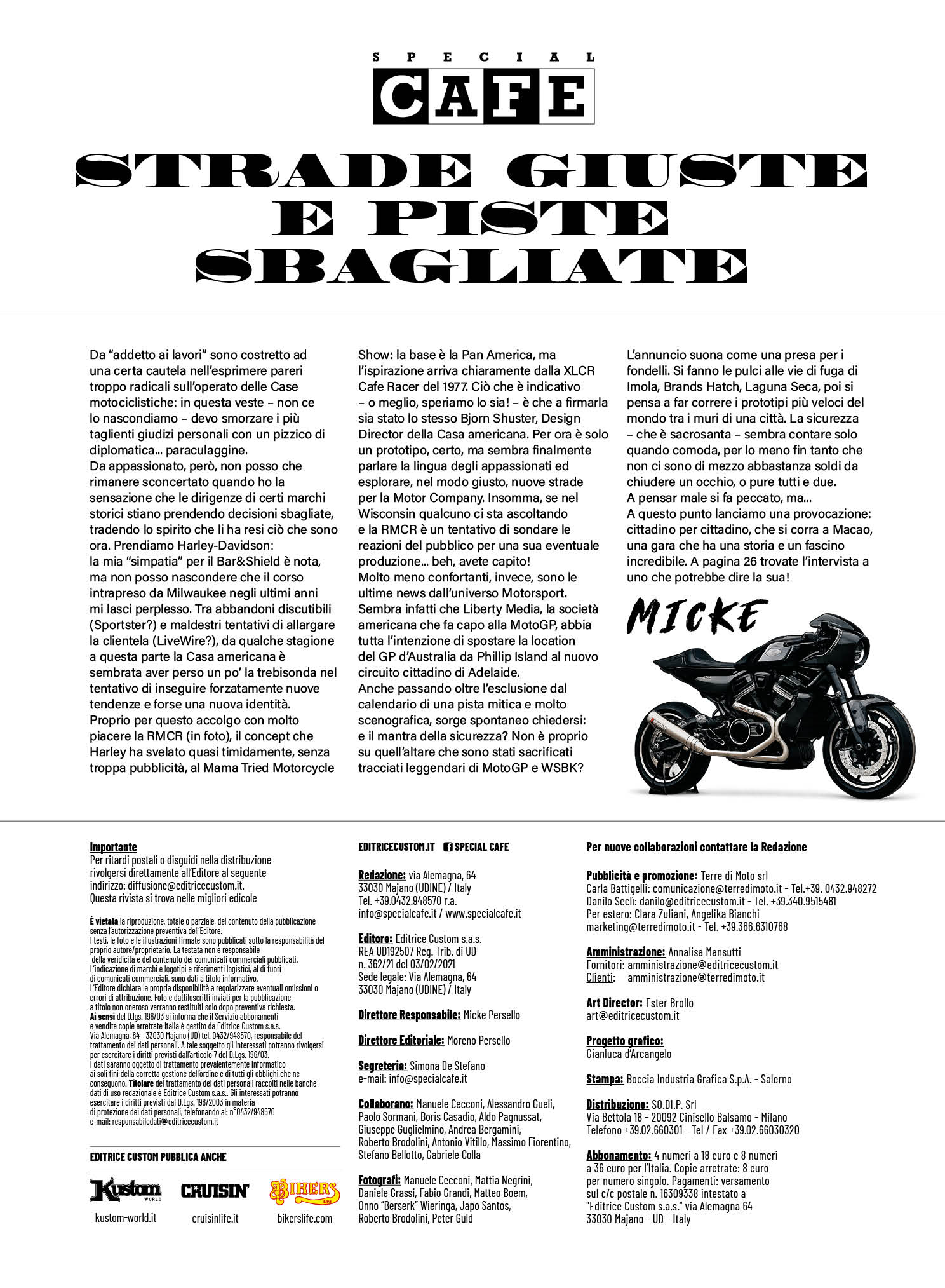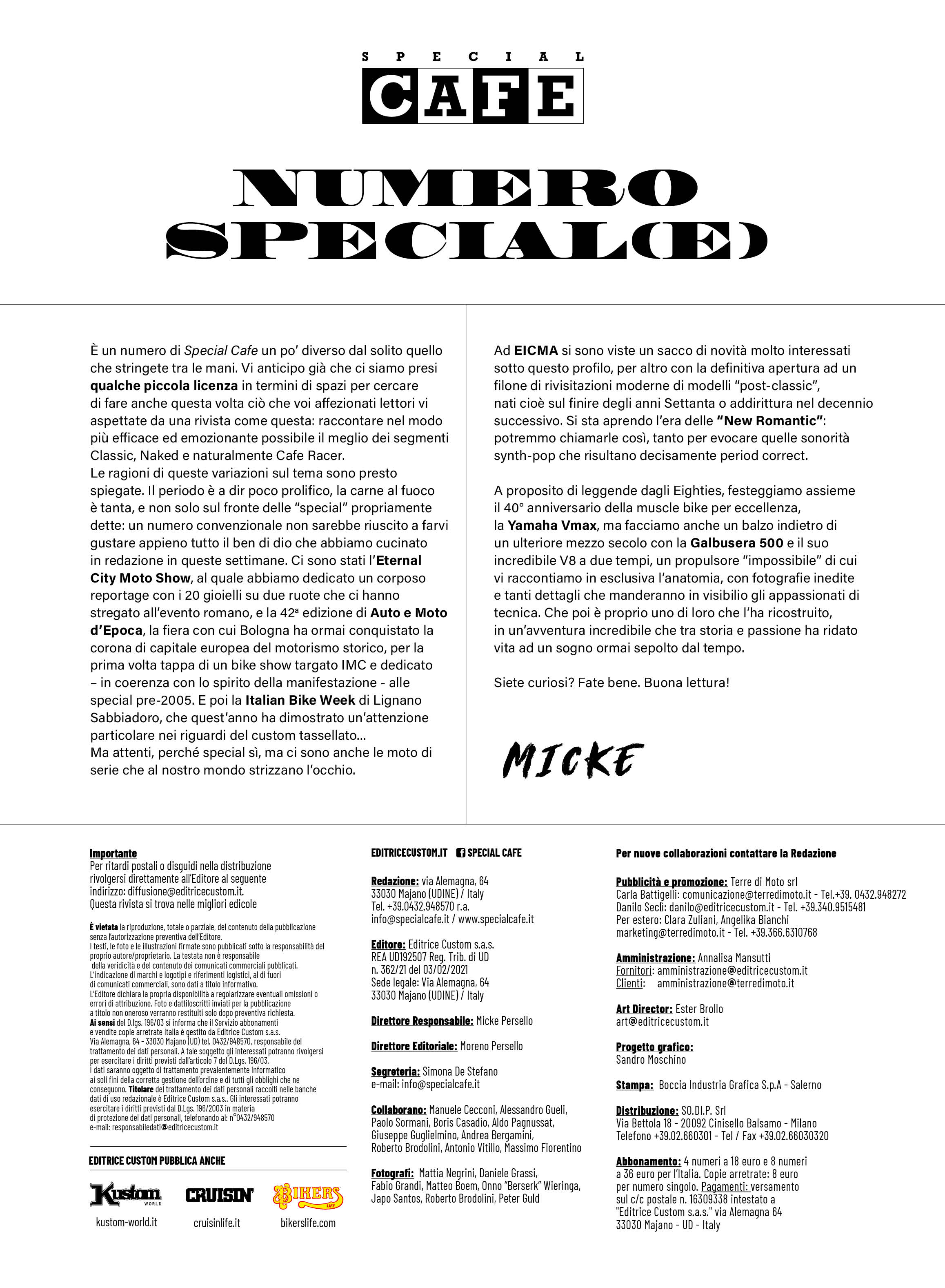 Special Café racconta le avventure, lo spirito e la passione dei rider più stilosi. Dedicato a Classiche, Naked, Scrambler e Cafe Racer, si muove nell'underground della cultura Rocker, dei personaggi e delle esperienze più rappresentative di uno stile di vita unico, toccando tutto ciò che gravita intorno a questo universo (lifestyle, abbigliamento, scenari musicali e artistici, tattoo, vintage race, burlesque, rockabilly, ecc)